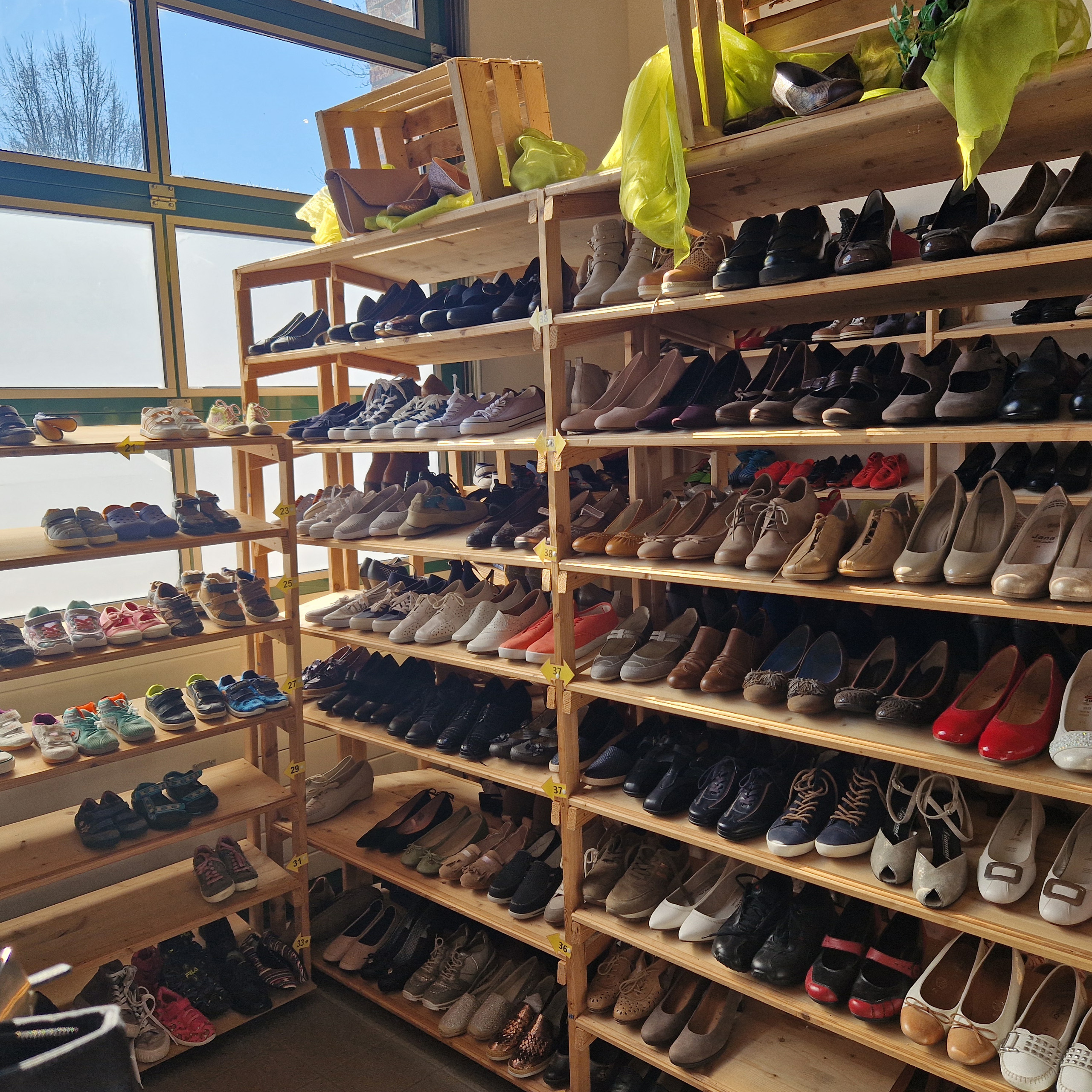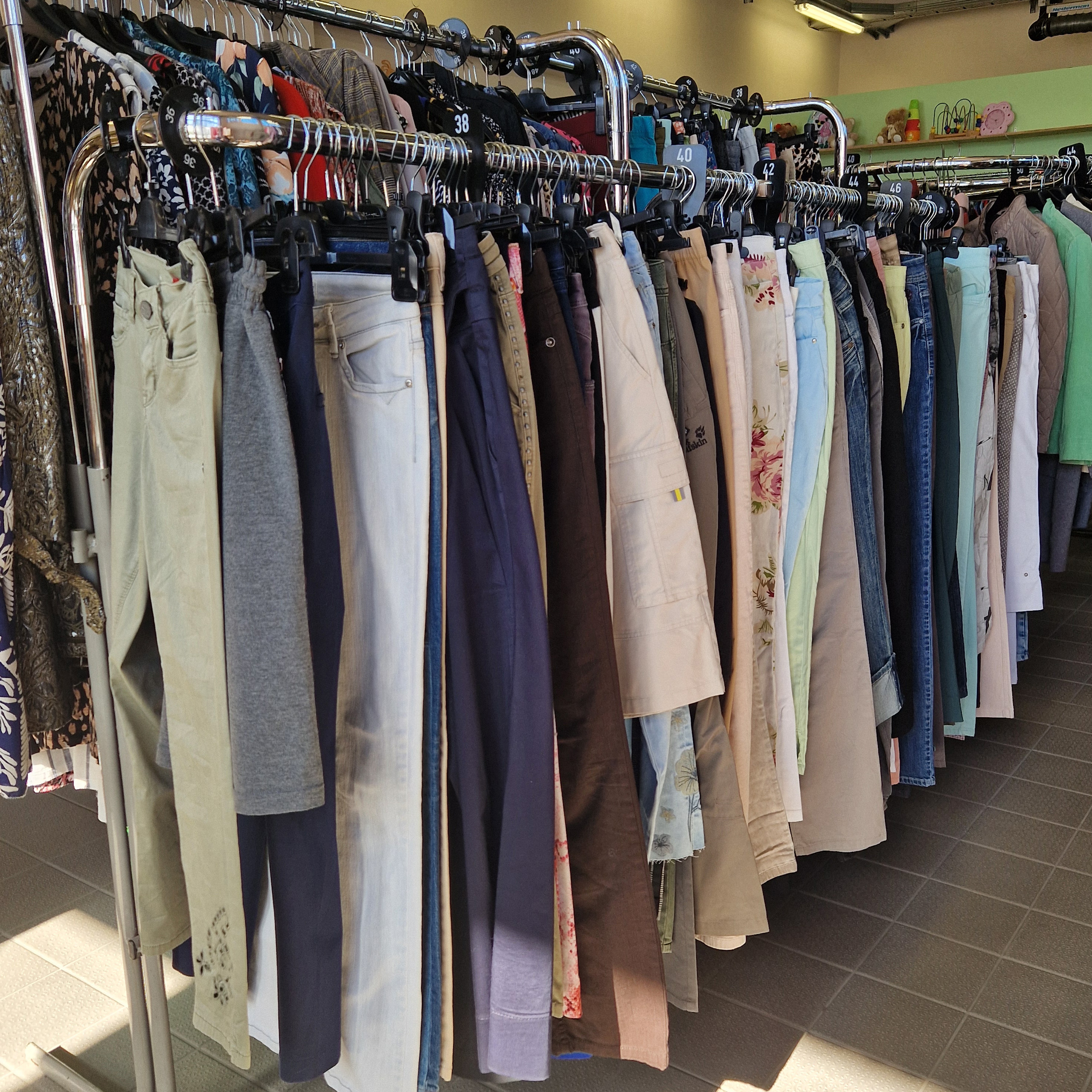 - Unsere ehrenamtlich arbeitenden Freiwilligen nehmen die Ware während der Öffnungszeiten an und sortieren, flicken, etikettieren und verkaufen die gespendete Ware zum kleinen Preis.